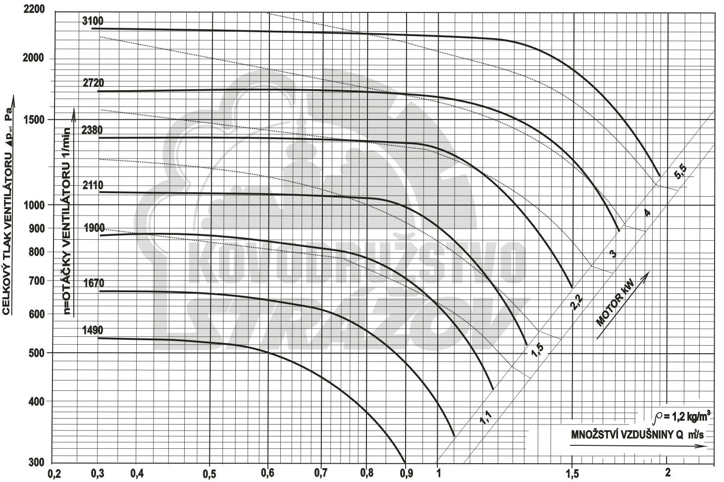 Výkonové oblasti ventilátoru RSS 400 na přímo - motor 1,1 kW, otáčky 1410 1/min
