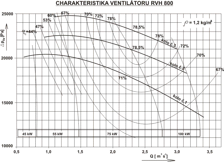 Ventilátor RVH 800 je dvoustupňový radiální vysokotlaký ventilátor, poháněný přímo elektromotorem s vyvedenými oběma čepy. Vzdušina je z prvního do druhého stupně ventilátoru přiváděna převáděcím potrubím.