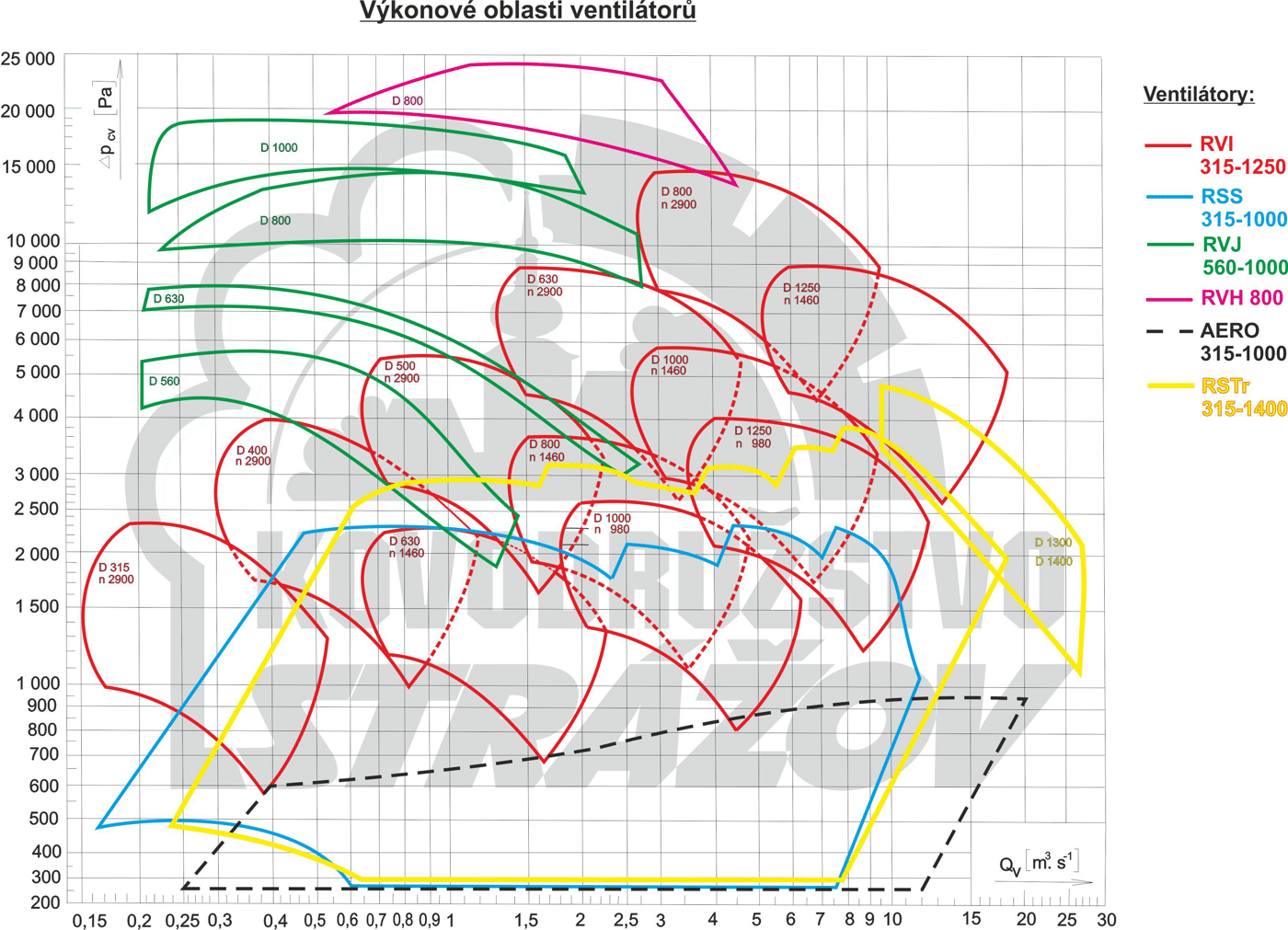 Výkonově lze ventilátory zařadit do nižší až střední třídy, tzn. dopravované množství vzduchu do 18 m3.s-1 a celkový tlak do cca 15 000 Pa popř.dvoustupňový RVH 800 do 24 700 Pa . Oblast použití těchto ventilátorů je značně široká. Od dopravy čisté tlakové vzdušiny, po dopravu mírně znečištěných vzdušin v průmyslu či dopravě průmyslových odpadů v dřevozpracujícím průmyslu, papírnách a podobných provozech, až po speciální ventilátory v nevýbušném provedení do ZÓNY 22 a ZÓNY 1 - dříve SNV 1, SNV 2, poplastované nebo pogumované ventilátory dodávané k pecím, kotlům nebo pro odsávání v chemickém průmyslu.